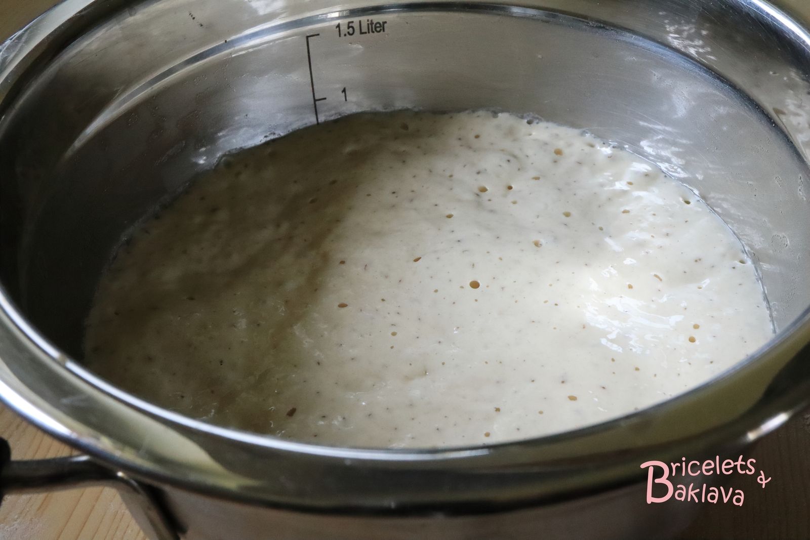 Couvrir et laisser fermenter à température ambiante, 3 à 4 heures (selon la saison) jusqu’au doublement de volume, la pâte fermente et fait des bulles.