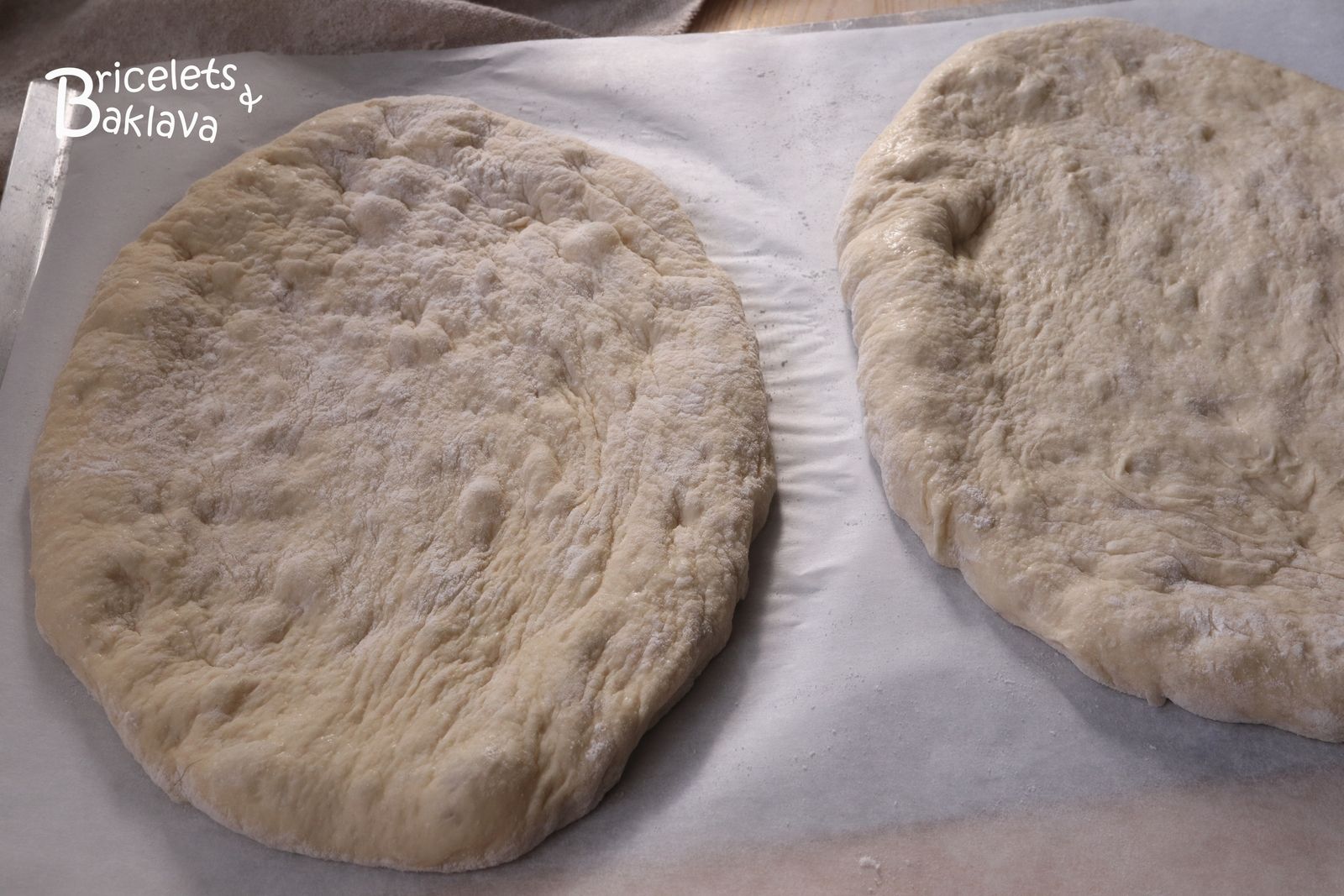 pour en faire des pains plats, de forme ronde ou ovale d’environ 15 à 20 cm de diamètre, comme pour une pizza épaisse.