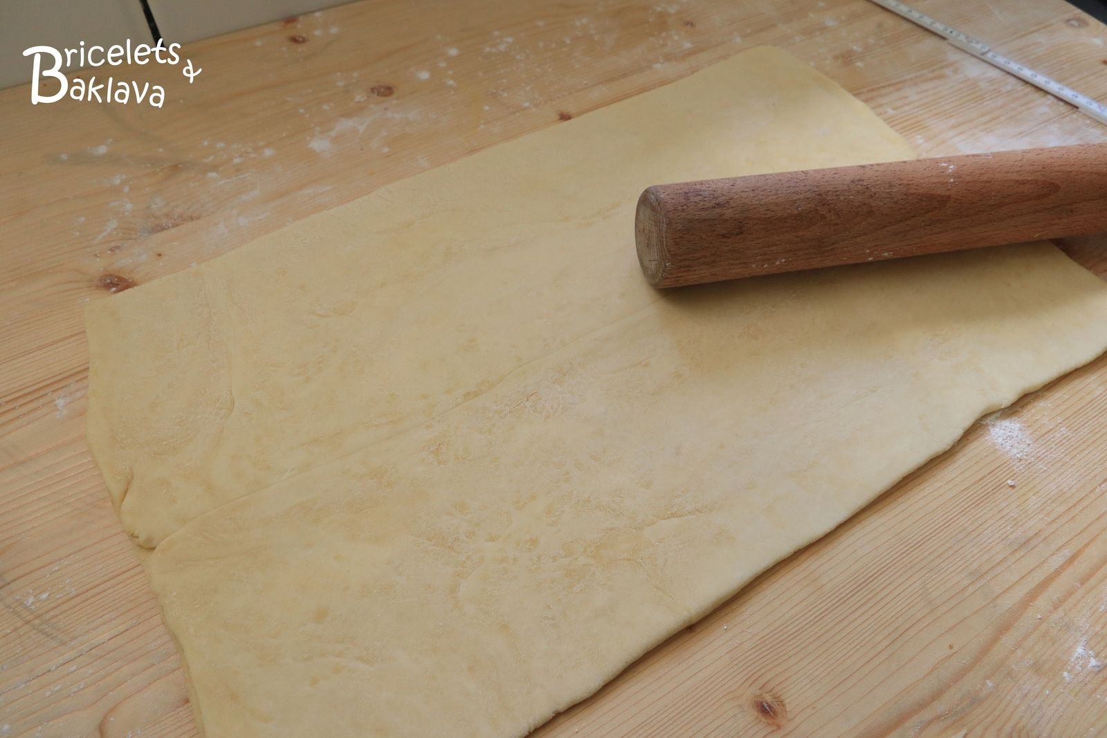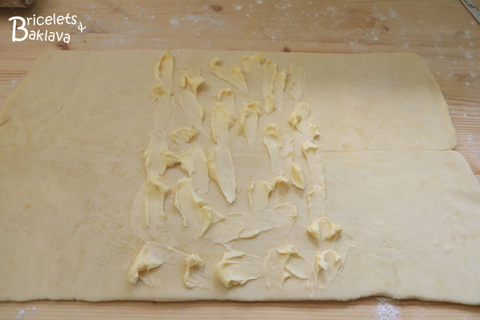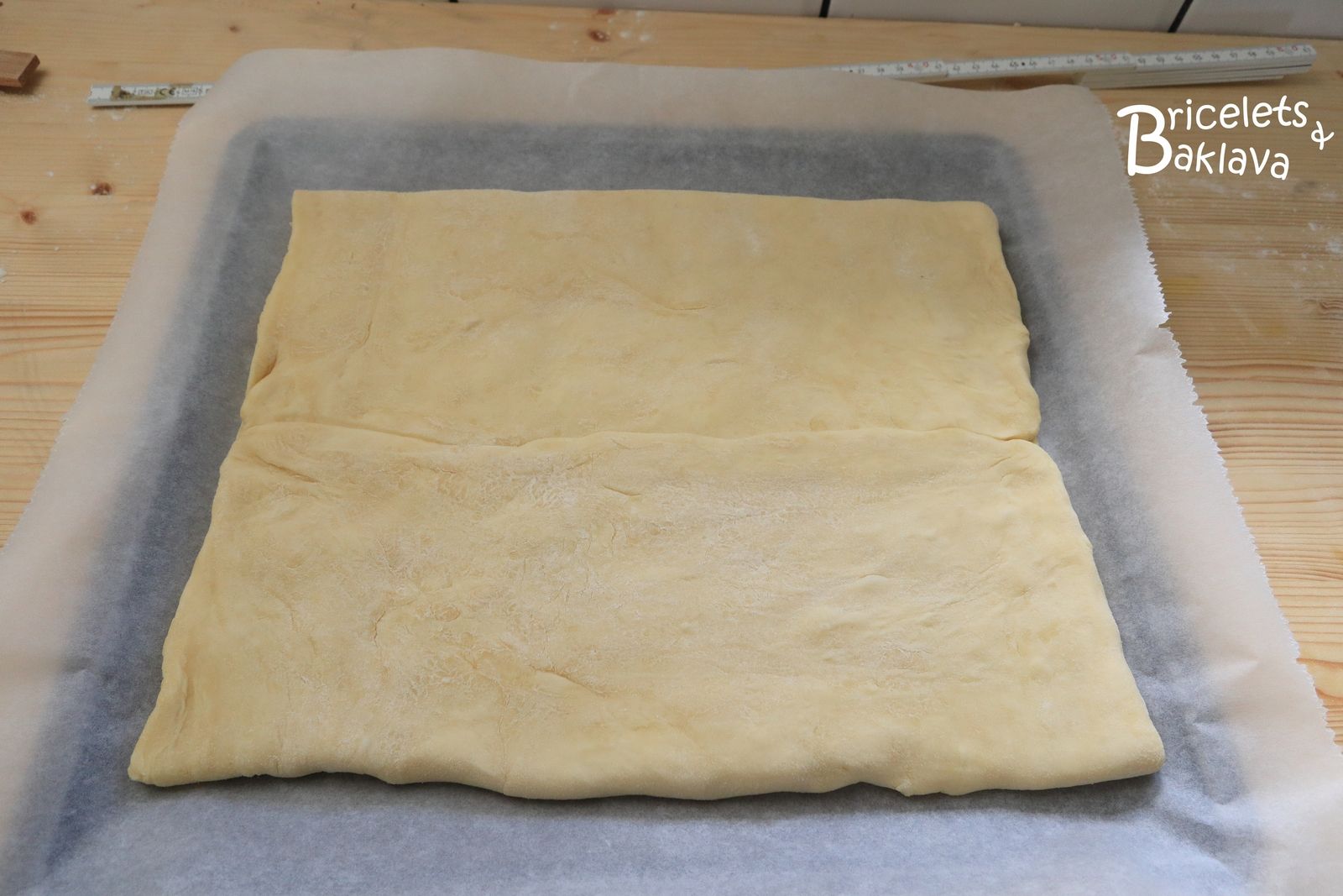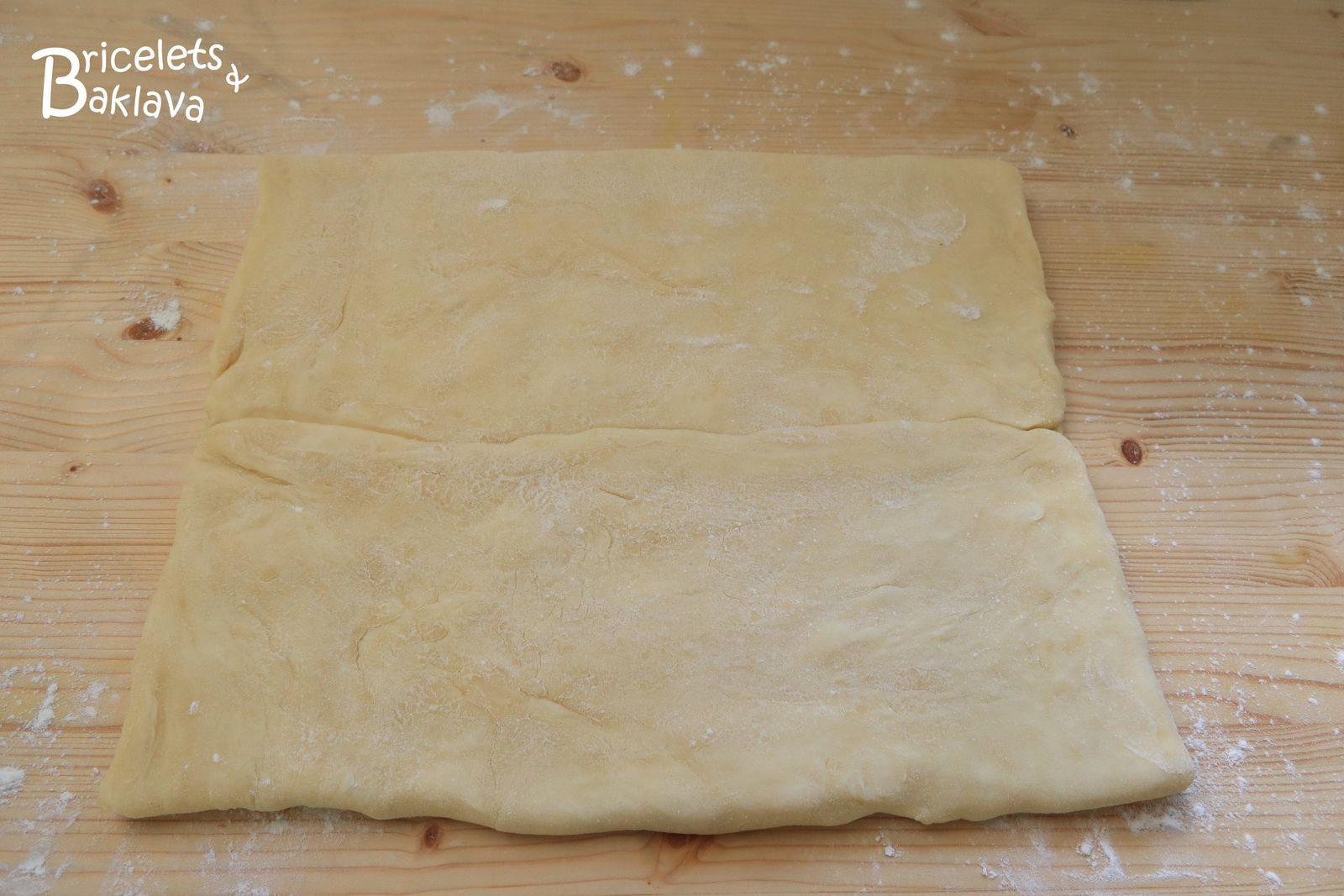 Rabattre le côté gauche jusqu’au centre puis ensuite le côté droit. On va obtenir un nouveau rectangle. Passer le rouleau délicatement afin de répartir le beurre, l’emballer et le réserver au frigo pour une heure.