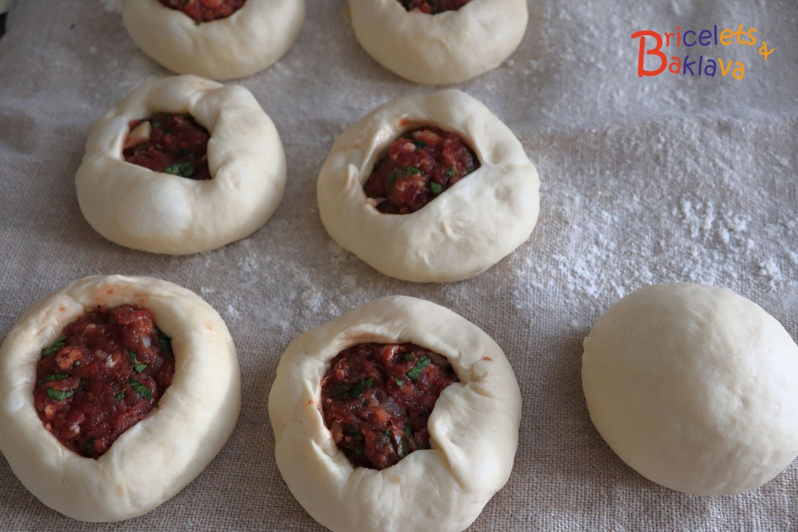 Cette courte description d’Urfa pour en arriver à une très ancienne recette tirée des archives du remarquable site (en anglais) www.houshamadyan.org. C’est une association qui a comme mission de reconstruire et préserver la mémoire de la vie arménienne dans l’Empire ottoman à travers la recherche. Sur leur site, l’énoncé de cette recette est des plus basique et j’ai essayé de la reconstituer au plus juste.Ce sont des sortes de beurek en pâte levée et garnis d’un mélange de bœuf haché ou d’agneau, d’oignons, d’herbes et d’épices. Ils sont en partie ouverts et frits dans l’huile. Ils pourront se consommer sur le pouce ou en entrée avec une belle salade de saison.