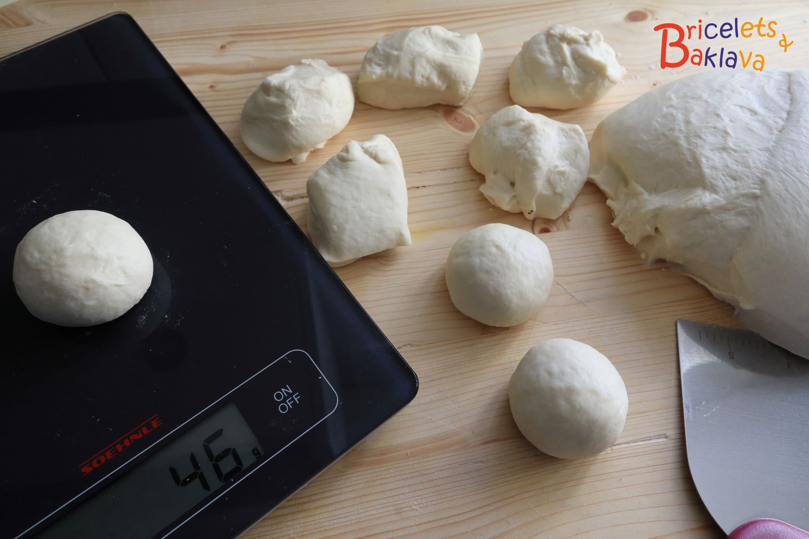 Transvaser la pâte sur le plan de travail fleuré et la diviser en 40 pâtons de 44 g.