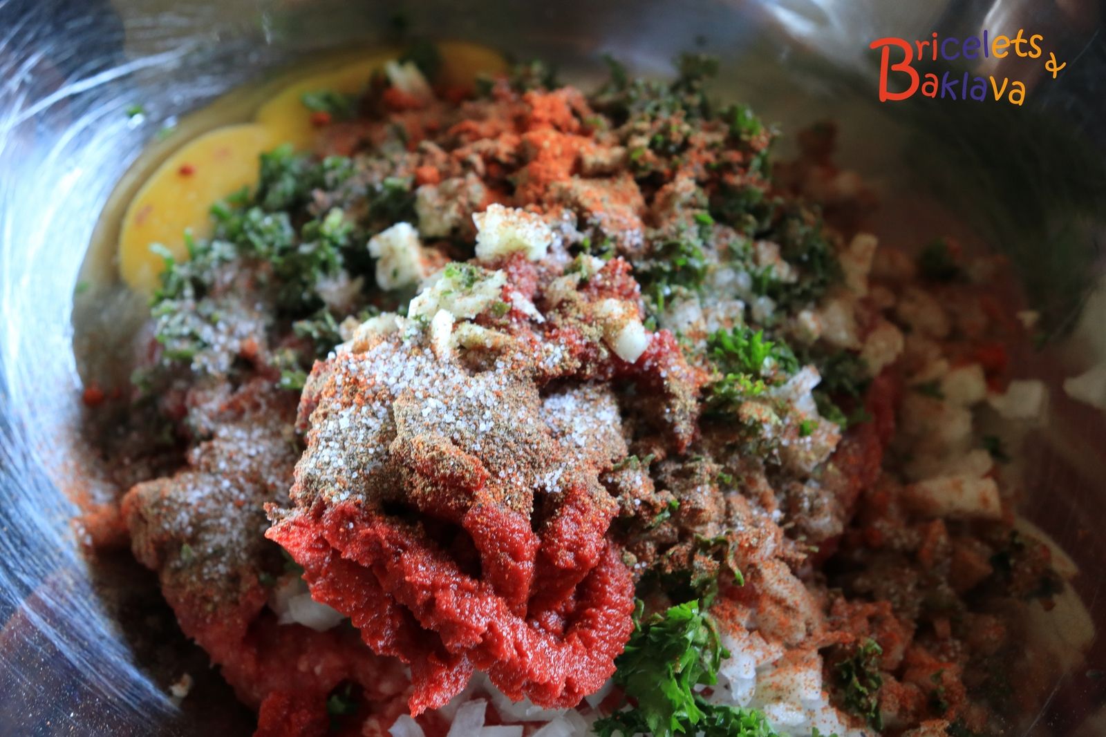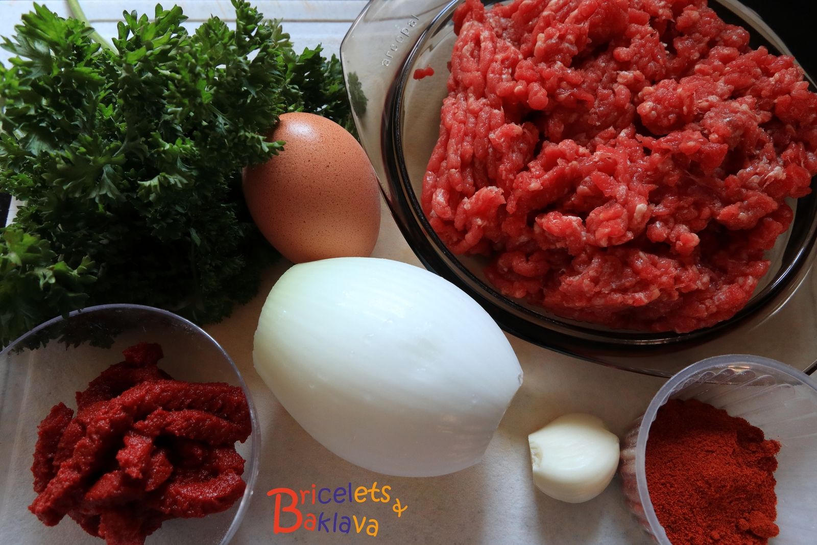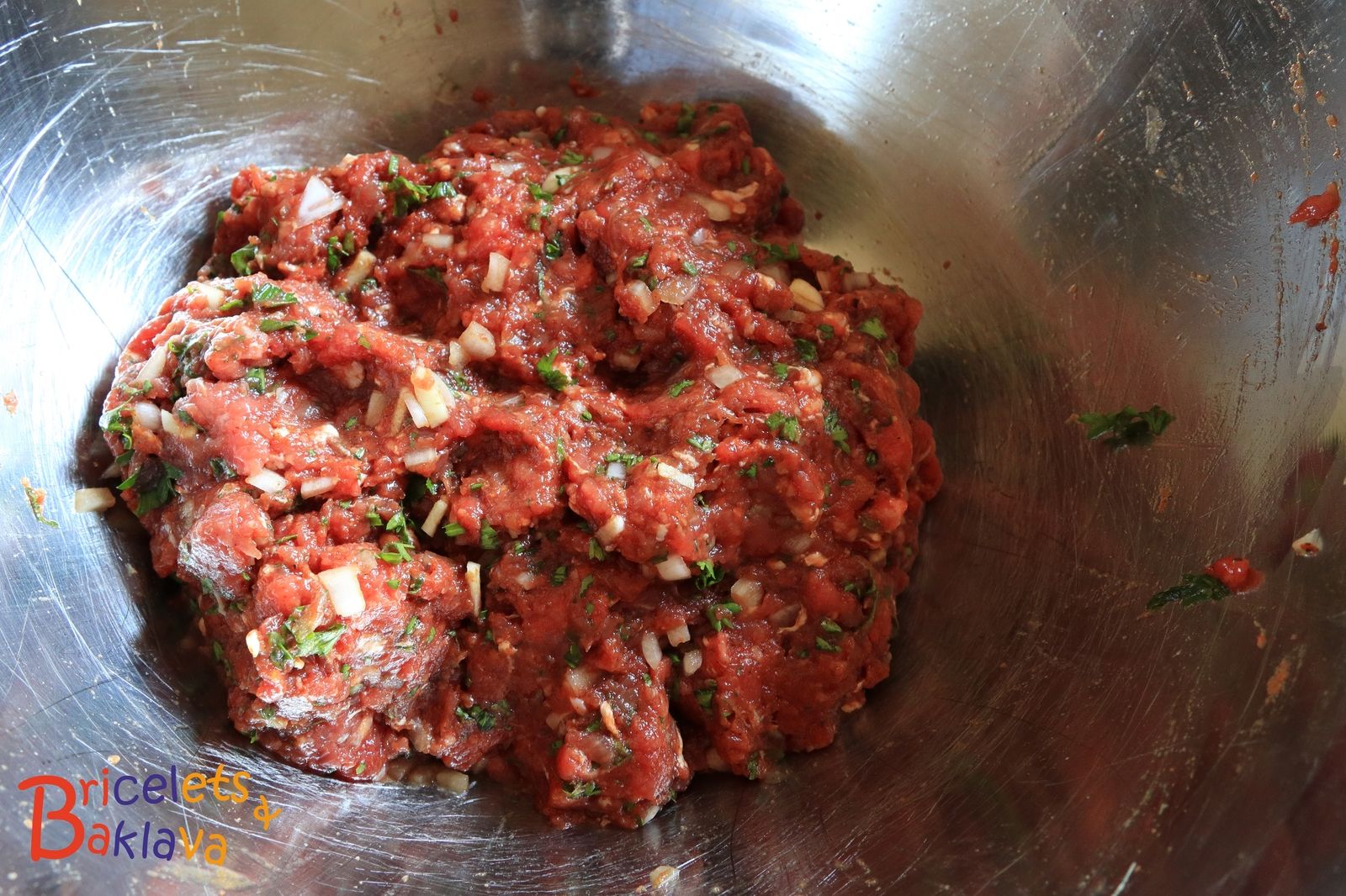 Emincer l’oignons, l’ail et le persil et verser sur la viande ainsi que tous les autres ingrédients.