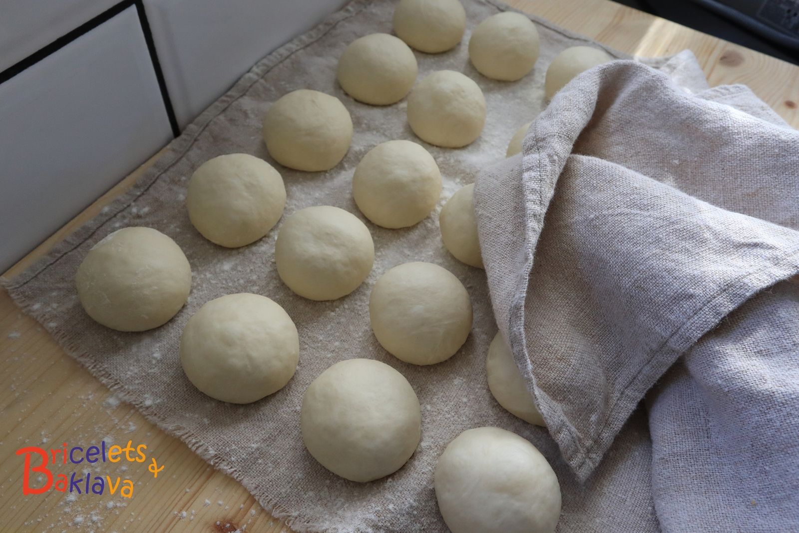 Bouler chaque pâton et les laisser se détendre pendant 10 mn sur le plan de travail fleuré, recouvert d’un torchon humide.