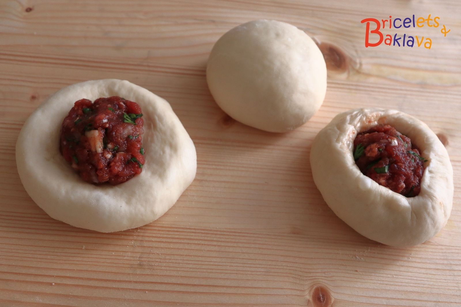 Pour la confection des semsek, voici la marche à suivre. Prendre une boule de pâte, sans la fariner ou juste très légèrement, la façonner en lui faisant prendre la forme d’une coupe avec un gros bourrelet tout autour. Déposer une boulette de viande et presser le bourrelet afin de presque refermer la boule de pâte. La farce doit rester apparente.