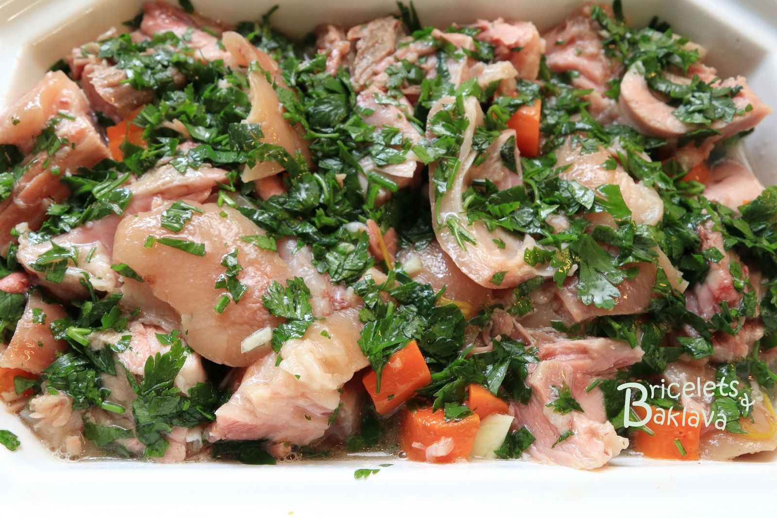 En fait, on aurait pu appeler cette terrine « jarret de porc marbré » tant les similitudes avec la "tête marbrée", sont présentes. Chez nous, dans la campagne vaudoise mais aussi dans le reste de la Romandie, la tête marbrée est une sorte de terrine élaborée à base de morceaux de viande de tête de porc, oreilles, museau, pied et coulés dans la gelée de cuisson, agrémentés de carottes, cornichons et autres condiments.