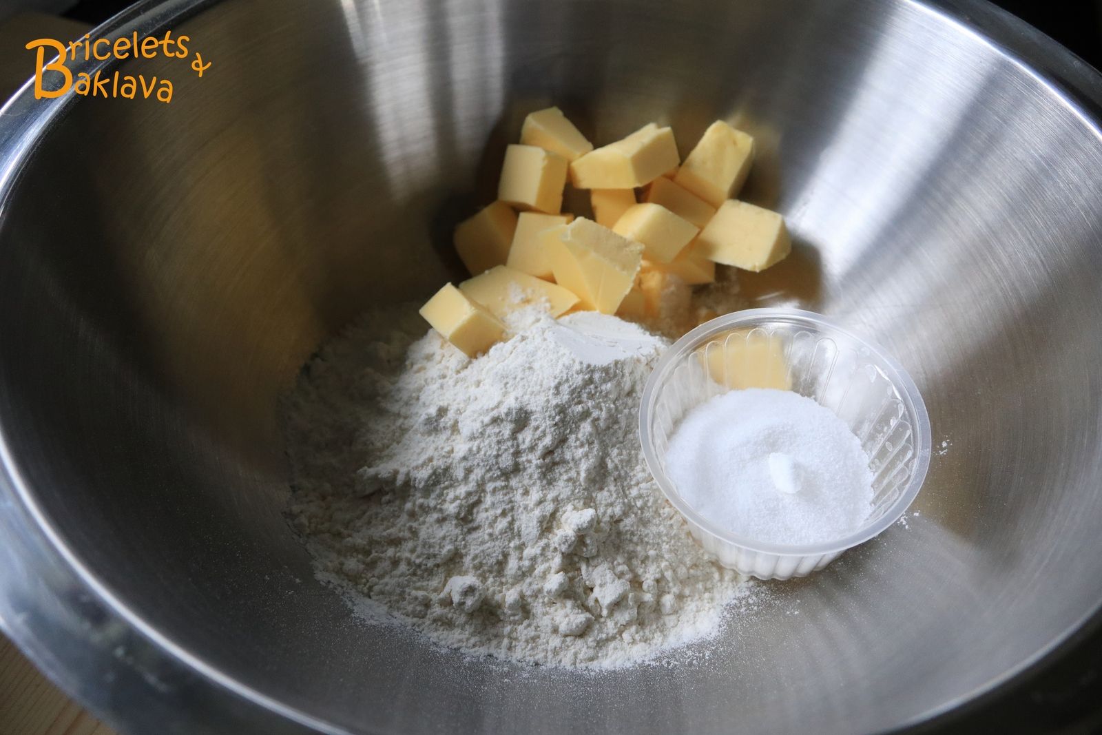 Dans un grand bol, mélanger la farine, le sucre et le sel, ajouter le beurre et malaxer entre vos doigts pour en faire une masse granuleuse.