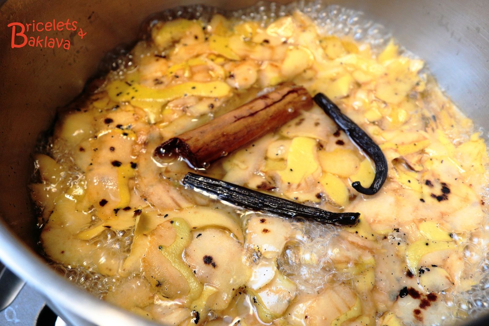 Rallumer le feu, y verser les épluchures et faire cuire le tout pendant une quinzaine de minutes afin que le liquide réduise et prenne la consistance d’un sirop léger.