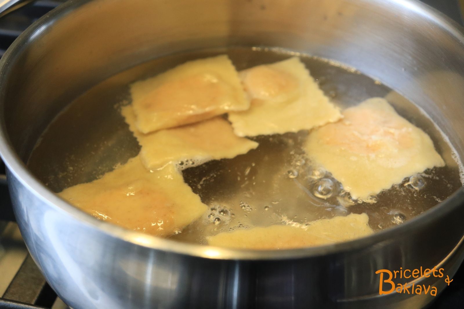 Dans une grande casserole, porter une bonne quantité d’eau à ébullition, saler, baisser le feu et cuire les raviolis par petites portions pour environ 4 minutes.