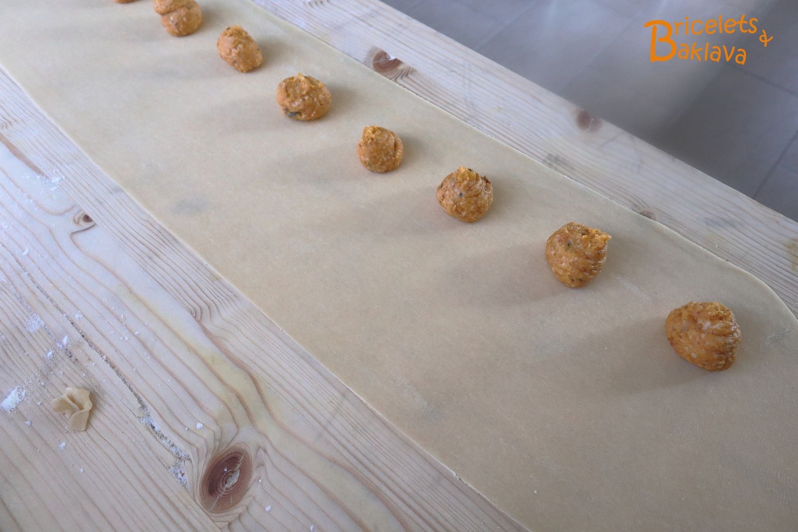 Sitôt une abaisse prête, déposer des rosaces de farce sur un des coté du ruban