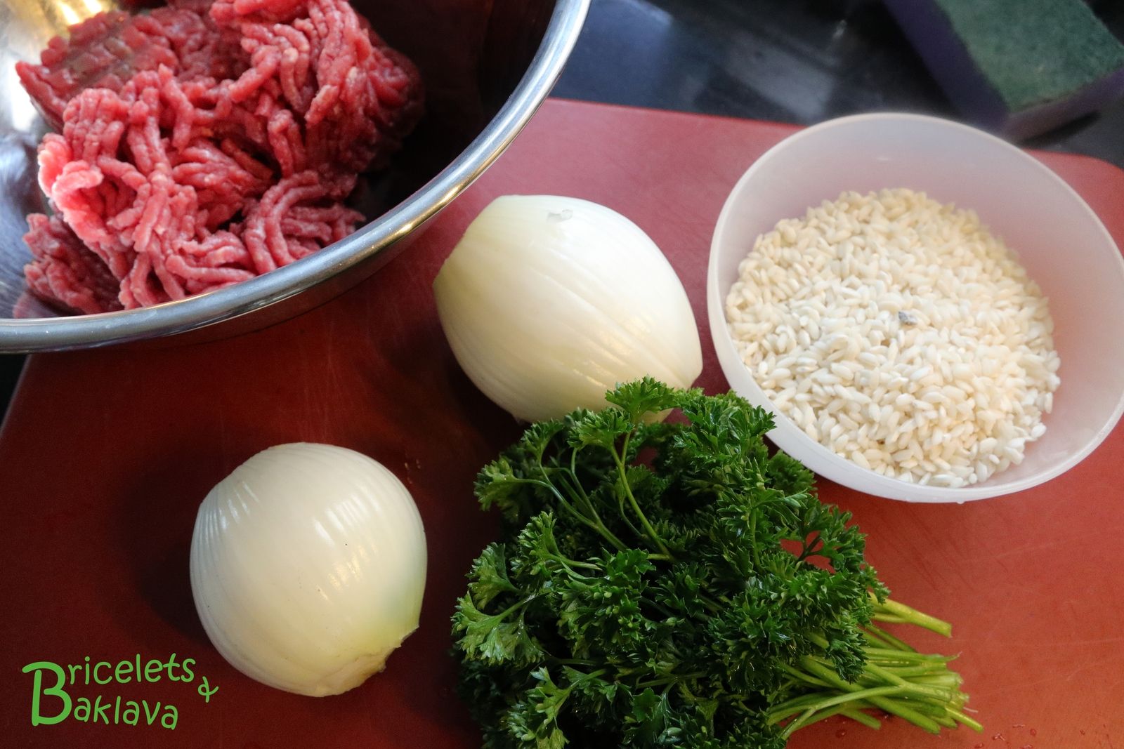 Dans un grand bol, mettre la viande hachée, ajouter le riz, les oignons, le persil, le concentré de tomate, les épices, le sel et une cuillère à soupe ou deux d’huile d’olive.