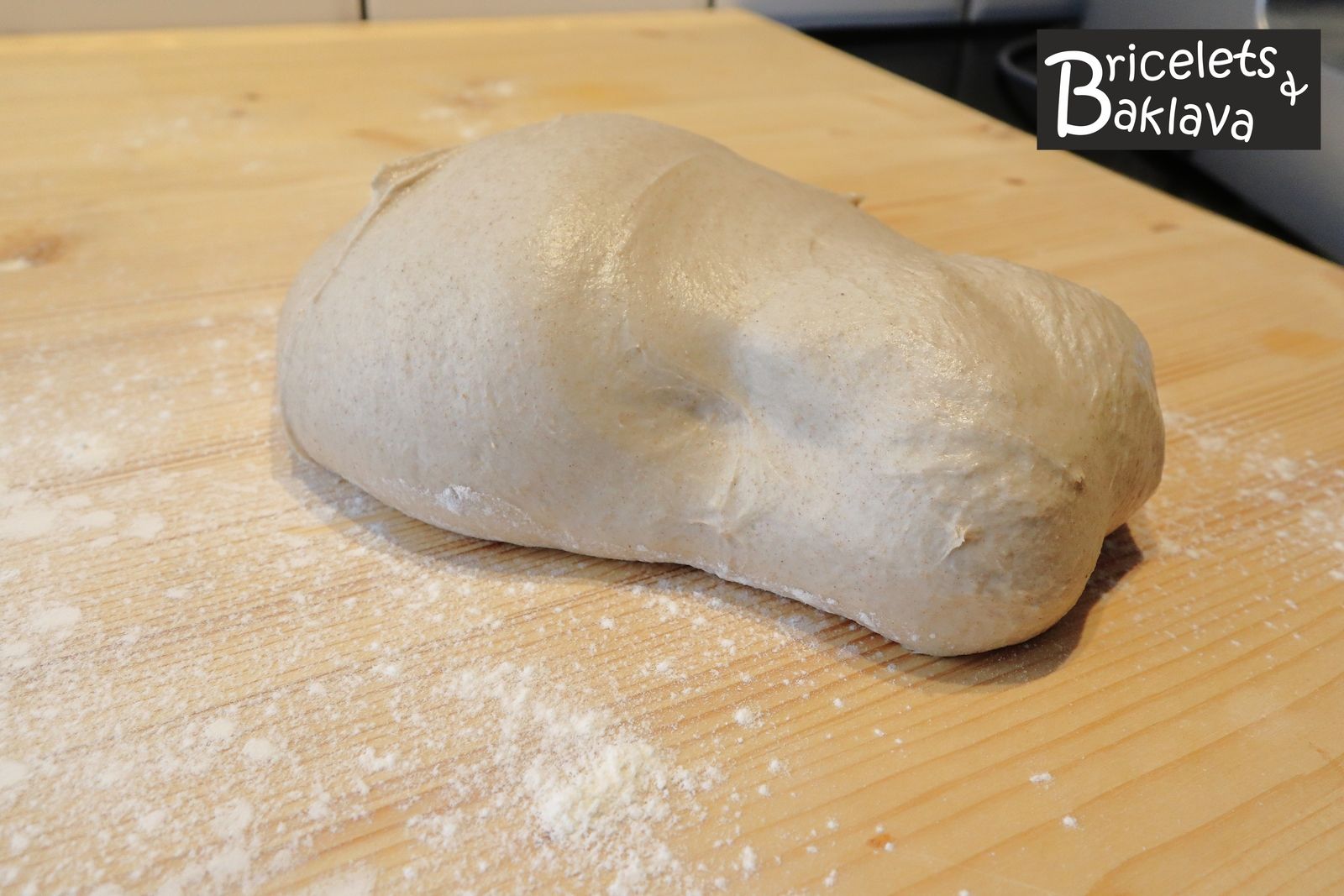 Après 45 minutes, faire un rabat (replier plusieurs fois la pâte sur elle-même) et remettre la pâte dans le saladier et faire pousser encore 45 minutes. Ces temps de pousse peuvent varier selon la saison ou la température des locaux.