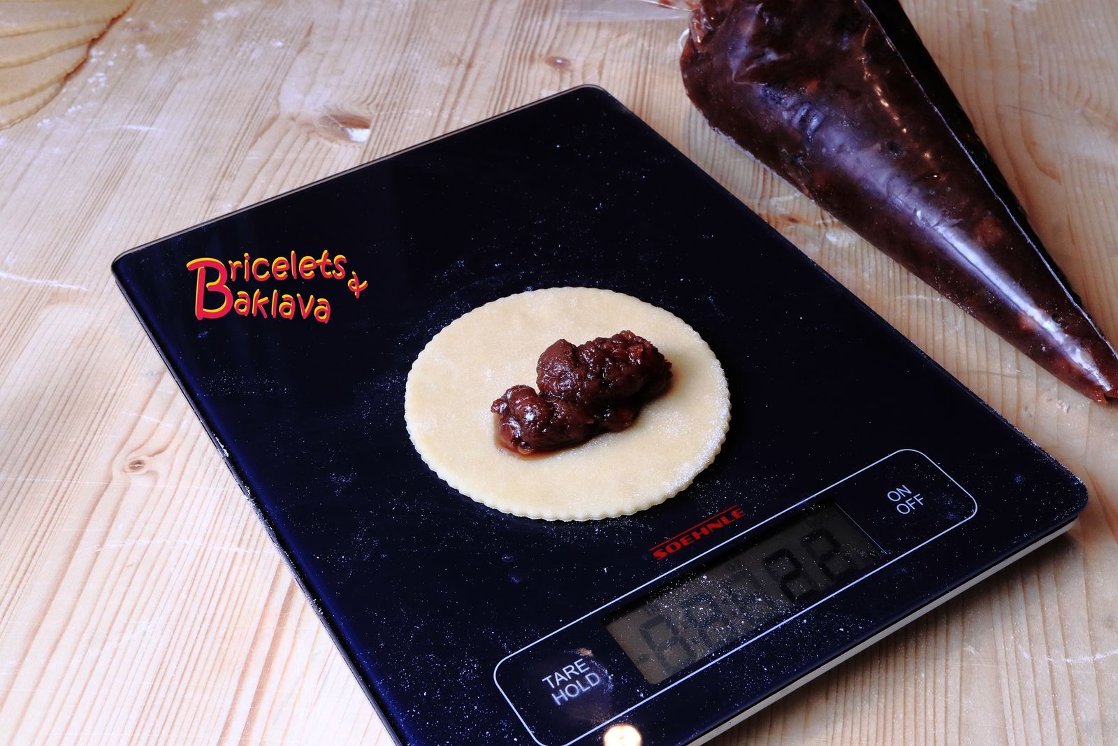 Comme ma recette ne contient que peu de sucre, je conserve cette farce dans des sacs à dresser que je mets au congélateur jusqu’au jour de la confection des rissoles.