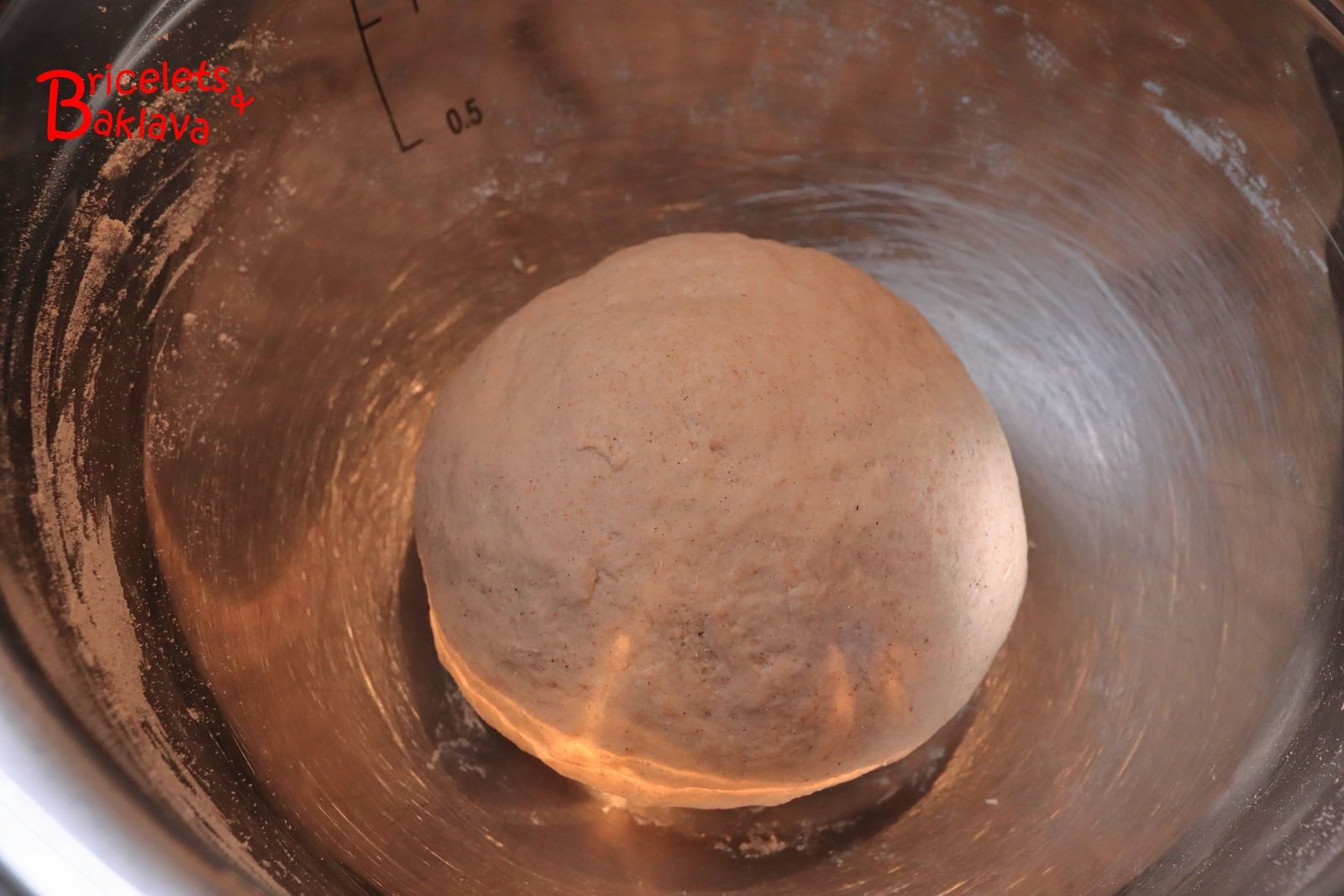en faire une boule bien ronde, la remettre dans la cuve, couvrir d’un film alimentaire et laisser pousser la pâte pendant environ 90 minutes.