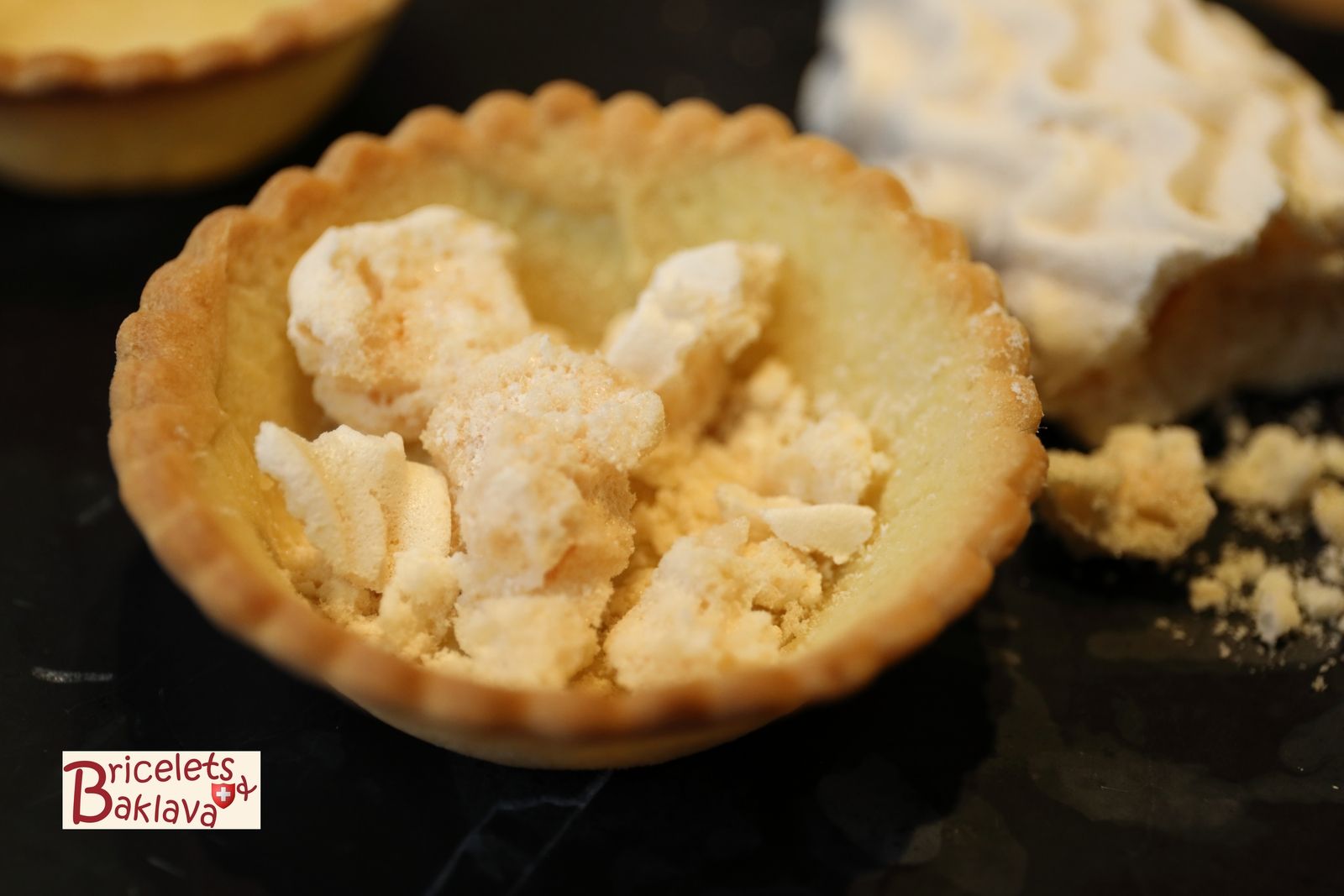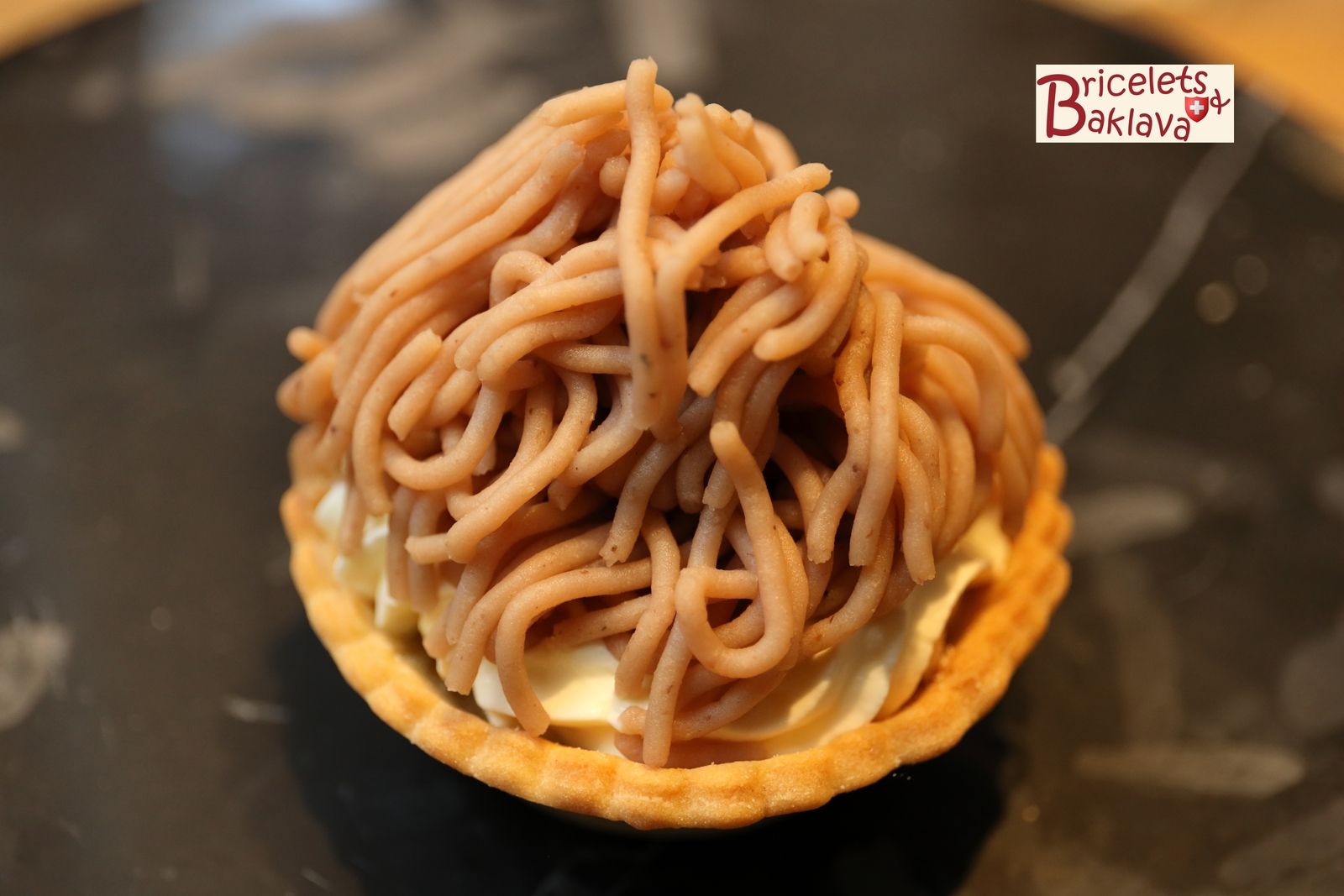C’est une tartelette en pâte brisée ou sucrée, garnie de meringue et de crème fouettée et recouverte d’une purée de marron sous forme de vermicelles. A son sommet, encore une rosace de crème surmontée d’une griotte au kirsch.