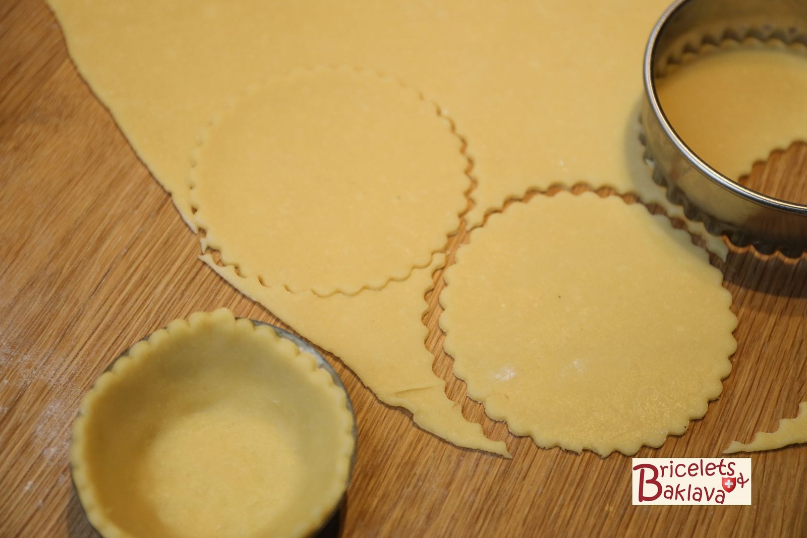 Beurrer ensuite les moules de cuisson puis à l’emporte-pièce cannelé, découper des cercles correspondants à la grandeur de vos moules. Ici les abaisses étaient de 100 mm.