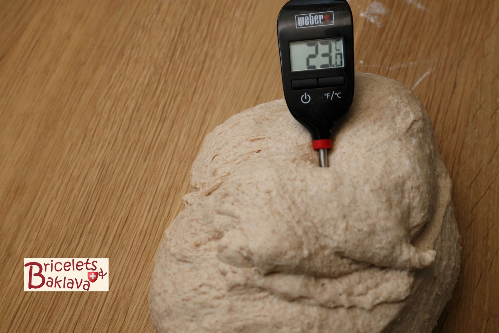 Ajouter le sel et continuer le pétrissage, toujours en 1ère vitesse pendant 6 à 8 minutes, cela peut varier d’une machine à l’autre. Il faut contrôler que la pâte soit bien lisse et élastique et que le gluten aie fait son réseau. La température de la pâte devrait se situer idéalement aux environs de 22-24°C.