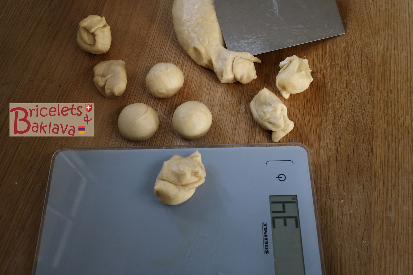 Une fois la pâte bien souple, la débiter en petites boules d’environ 35 grammes. Vous devriez en obtenir 24.