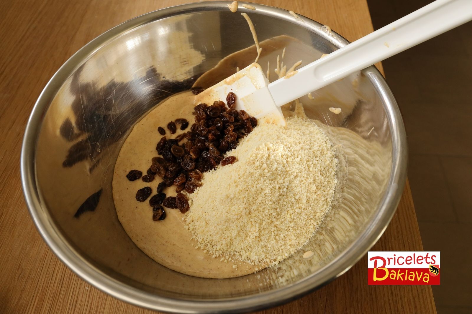 La transvaser dans un saladier et ajouter les amandes et les raisins secs et bien mélanger le tout.