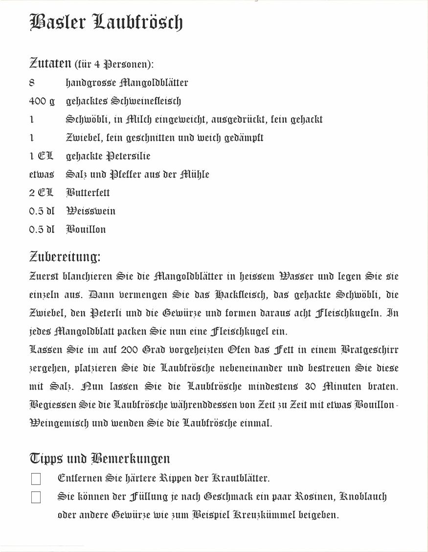 Ne vous inquiéttez pas, ces petites grenouilles toutes vertes appelées aussi reinettes, n’ont ici que le nom. En fait à Bâle, ces « Laubfrösche » sont des feuilles de bette, d’épinard ou de choux remplies de viande hachée, qui ont été façonnées en paquets et cuites dans du bouillon. Pourquoi les bâlois les nomment comme ça, je ne sais pas, peut-être pour la forme et la couleur.