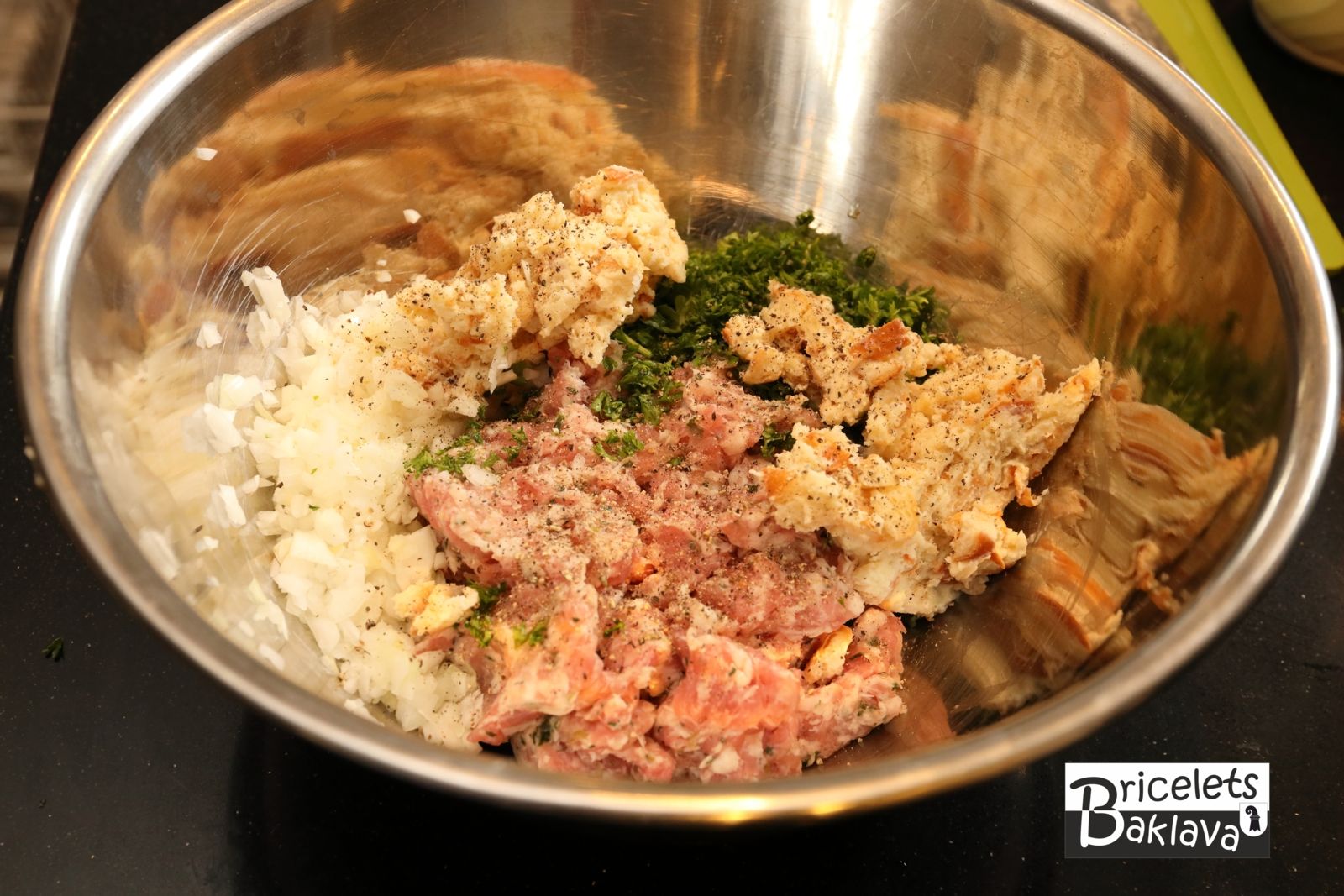 Une fois bien ramolli, les hacher au couteau et les ajouter à la viande hachée.