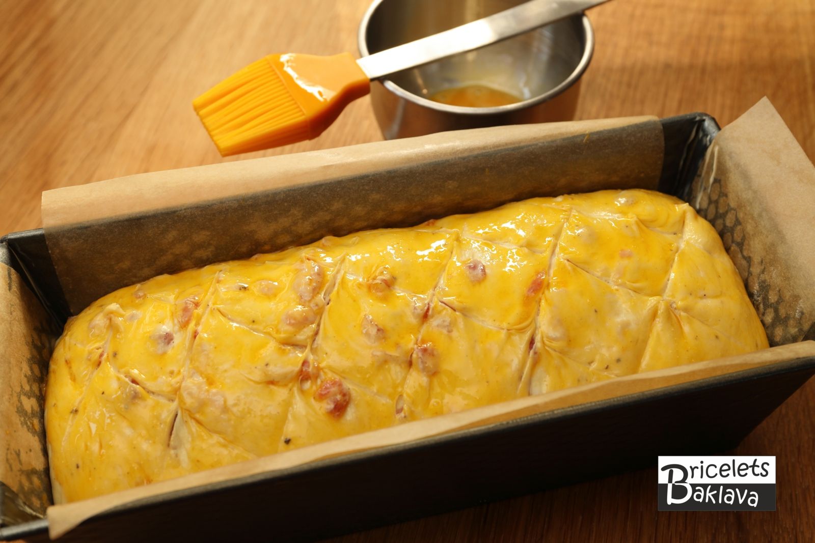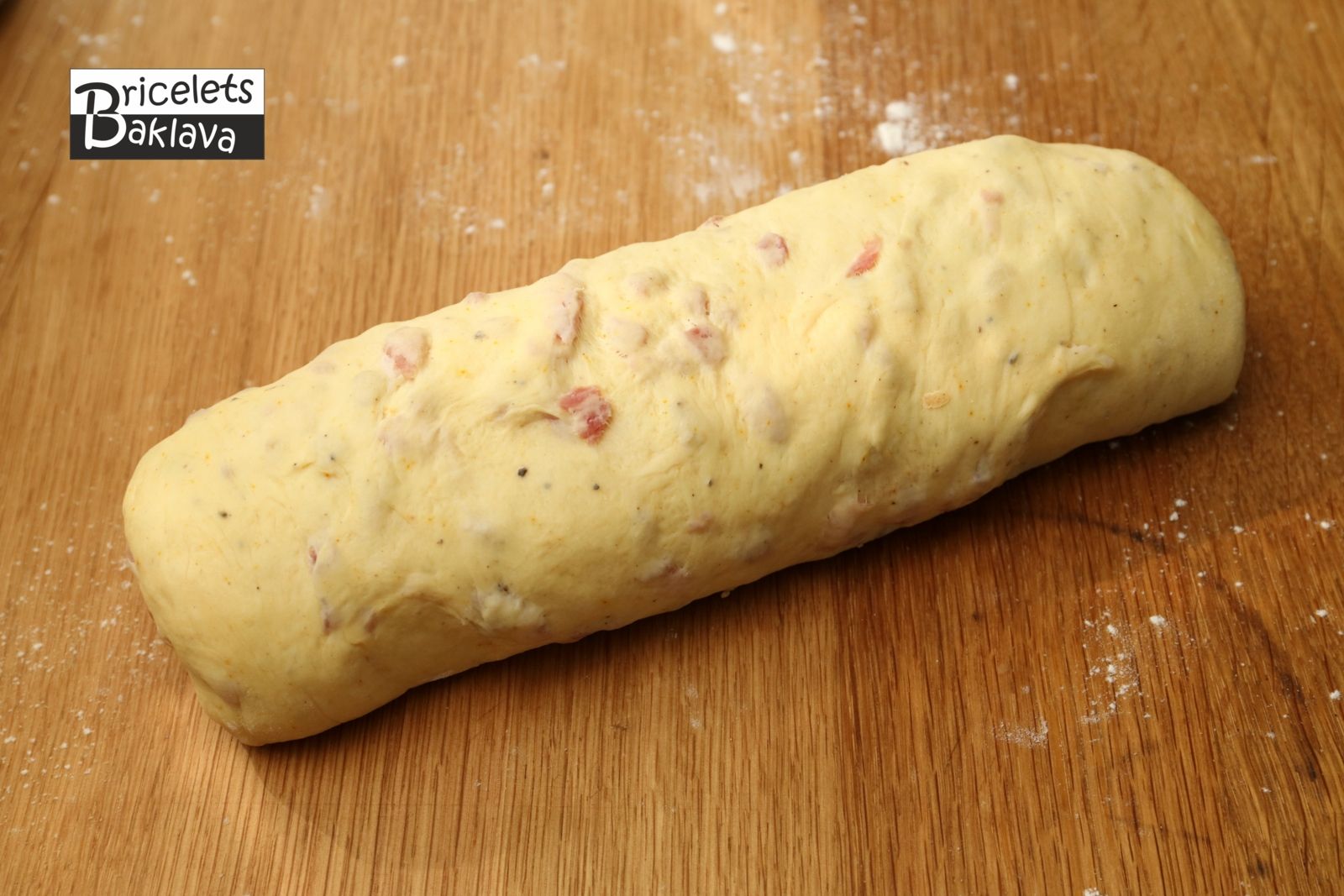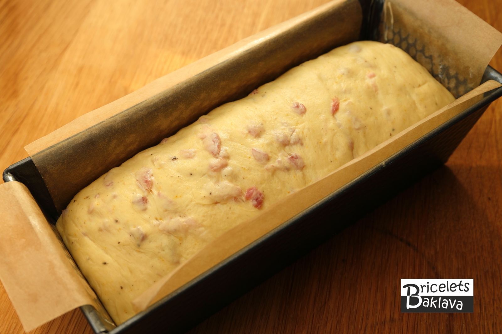 Donc voici cette recette qui contrairement à la majorité des cakes salés, ne contient pas de levure chimique mais de la levure de boulanger. Donc la pâte devra lever avant d’être enfournée. Ici c’est une pâte à cuchaule, une spécialité fribourgeoise dont la recette est ICI. C’est une pâte levée à base de farine, lait, beurre et parfumée au safran. Pour ce cake j’y rajoute des lardons prélevés dans une plaque de lard fumé à la borne. La borne est une grande cheminée de ferme et la charcuterie qui a passé par là en ressortira presque noir au fort goût de fumée. Vous trouverez quelques explications plus détaillée ICI. Mais un lard fumé traditionnel conviendra parfaitement.