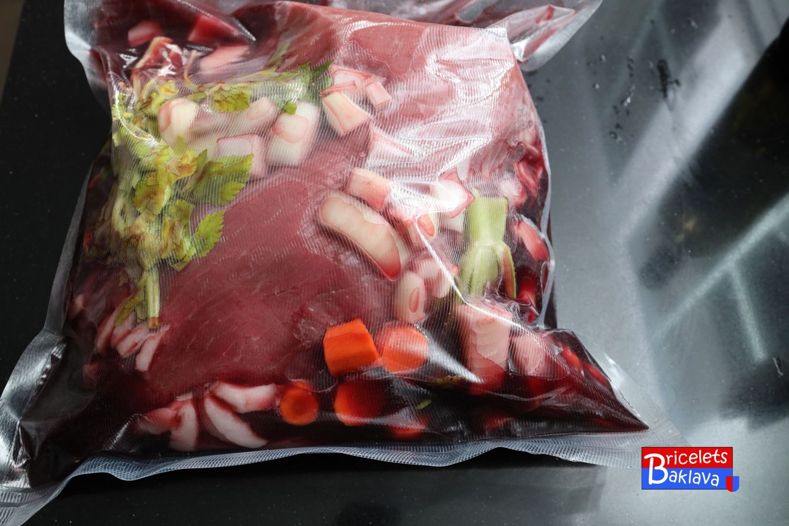 Rem. Pour cette recette j’ai choisi de laisser macérer la viande dans un sachet plastique résistant qu’il faudra retourner une à deux fois.