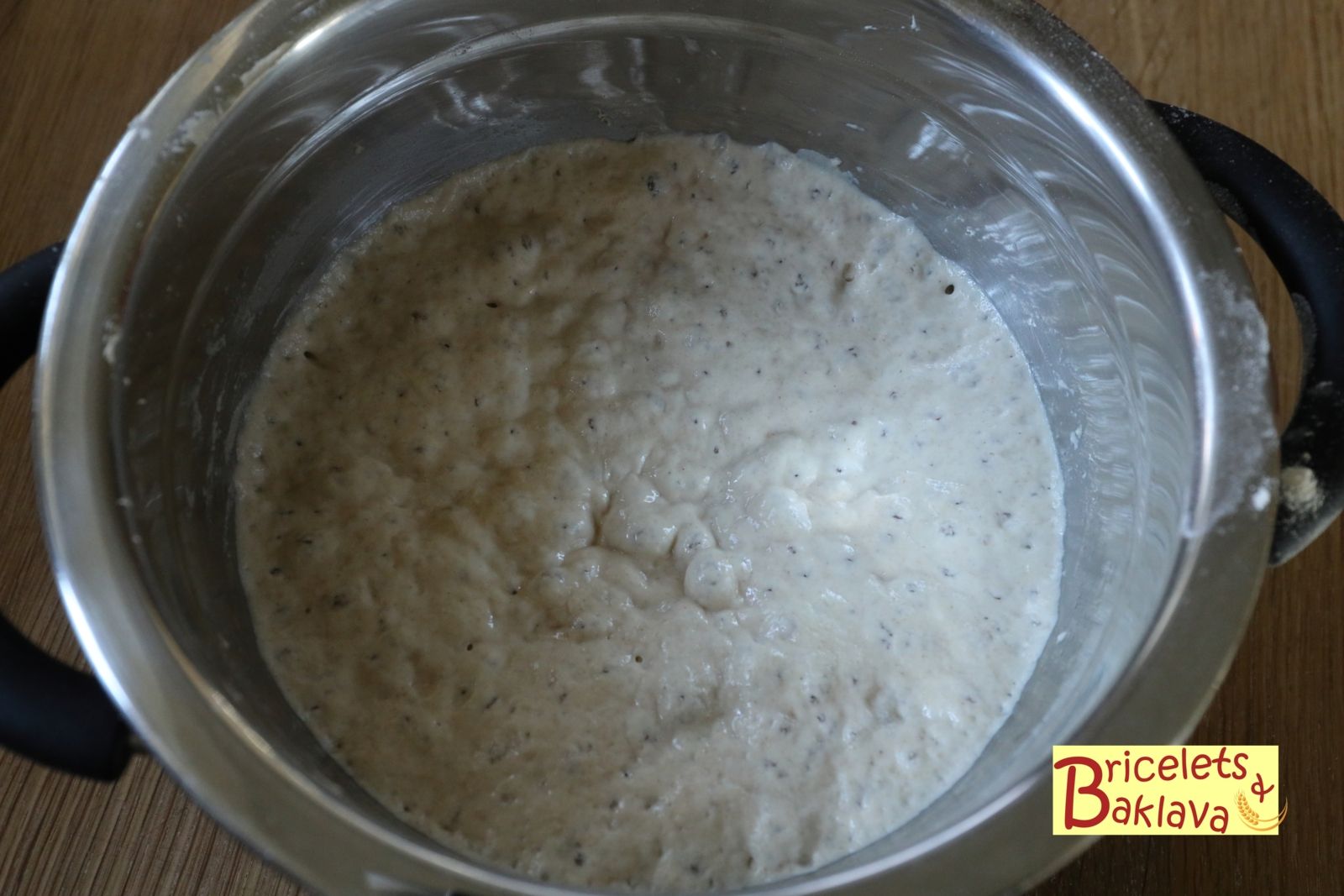 Mélanger le levain (ou la levure) dans de l’eau légèrement tiède, ajouter la farine, brasser et pétrir en une pâte assez ferme.