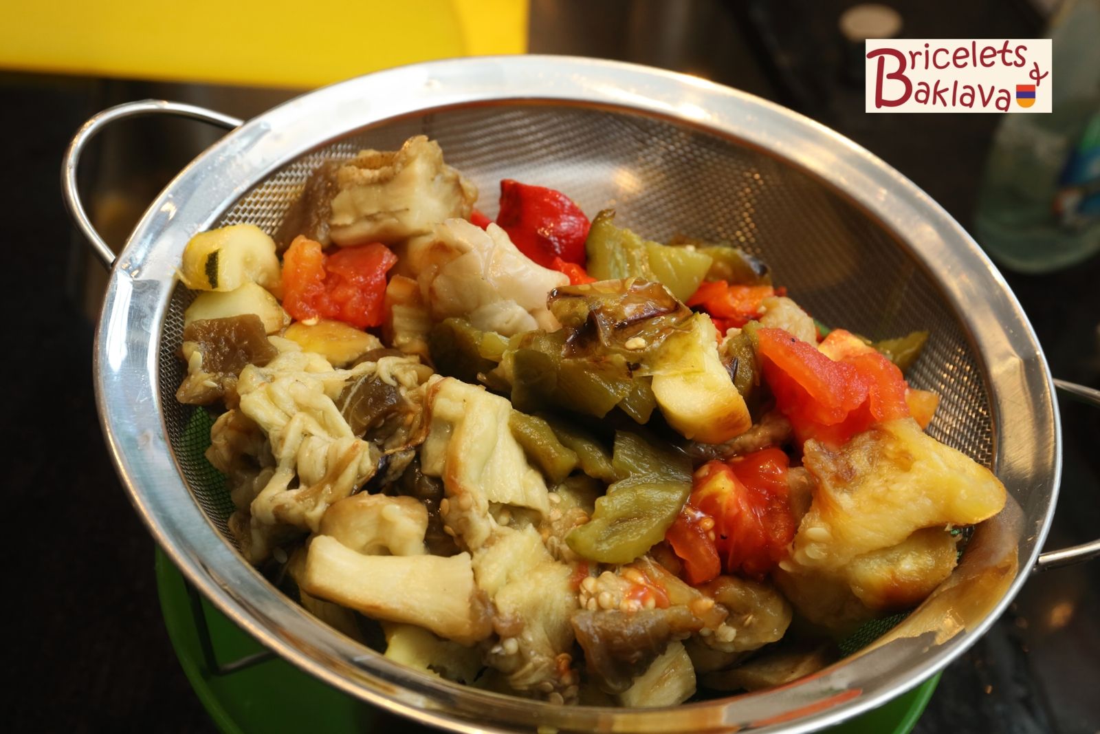 Lors de la préparation des khorovats (de viande d'agneau, de bœuf, de poulet, de porc), une pratique courante consiste également à griller des brochettes de tomates et d’aubergines, qui sont servies encore chaudes, entières et sans fioritures.