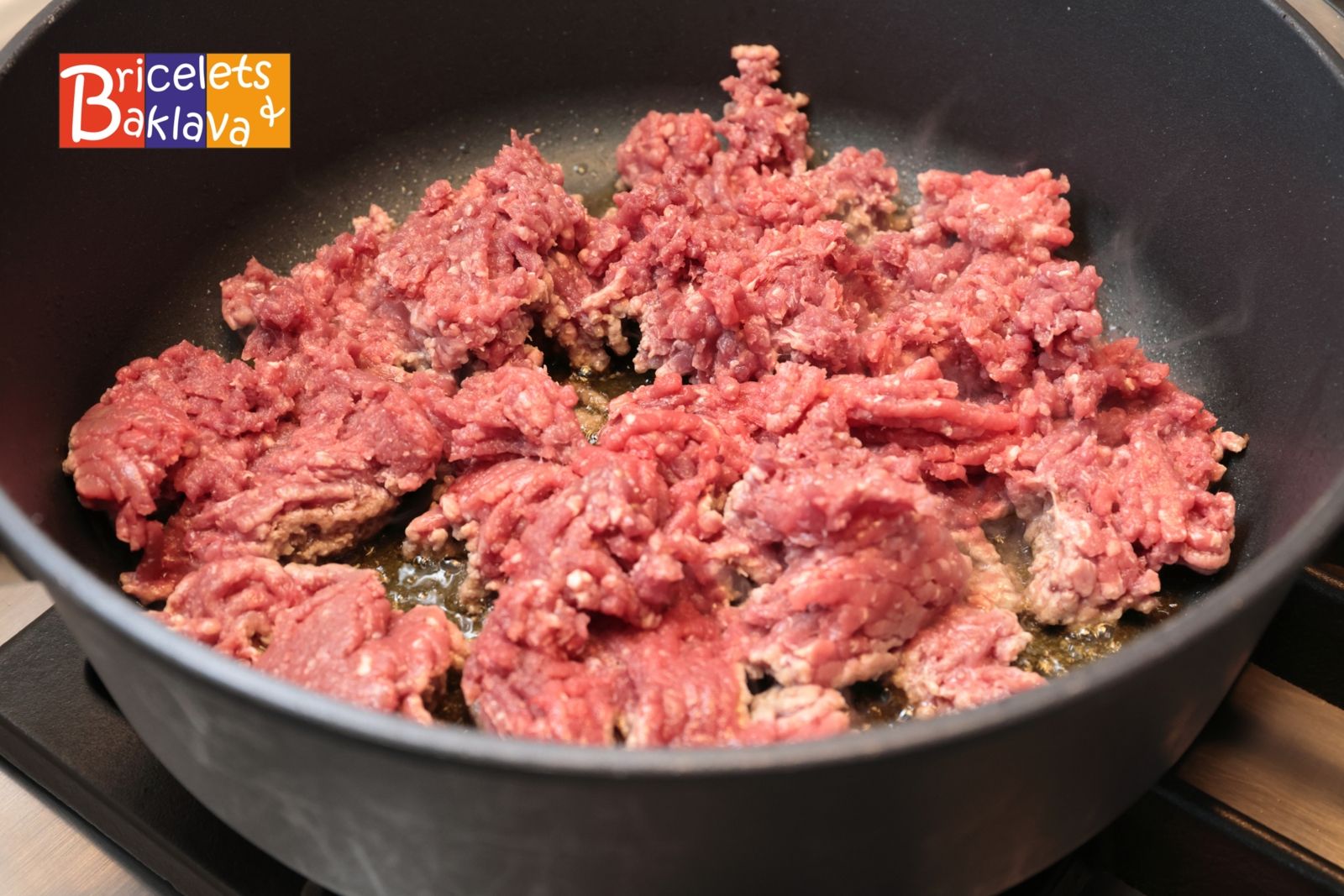 Dans une poêle, chauffer deux cuillères à soupe d'huile d'olive et y faire revenir la viande hachée sur feu vif,