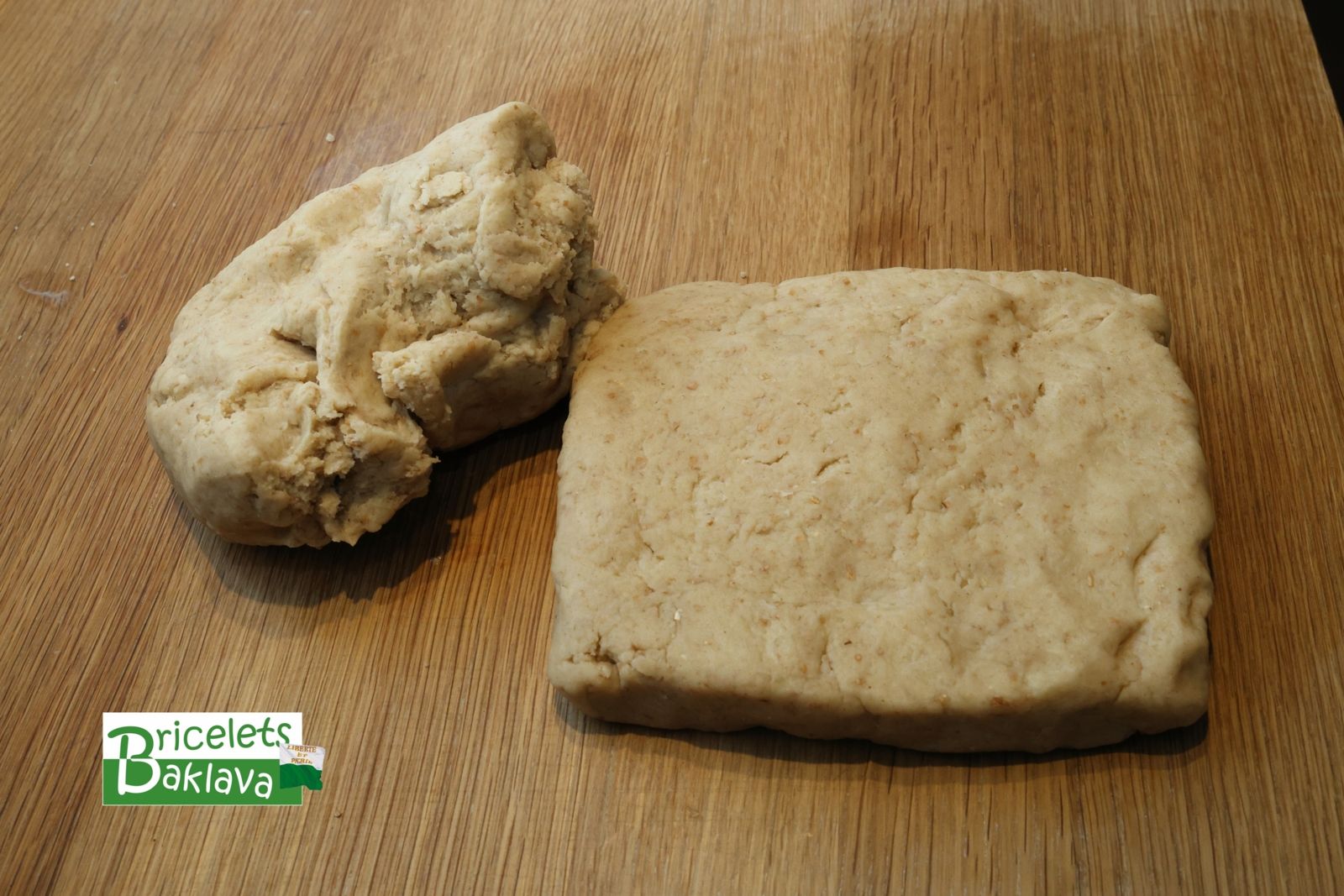 Diviser cette pâte en deux portions, les aplatir pour former deux pâtons carrés, ceci facilitera le travail par la suite.